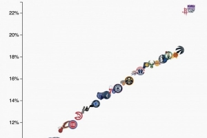 本赛季各球队中投(10英尺-三分线之间)占比如图所示,拥有德罗赞的国王和杜兰特的火箭占比超过22%,联盟独一档,公牛则不到7%联盟最低,也算独一档。